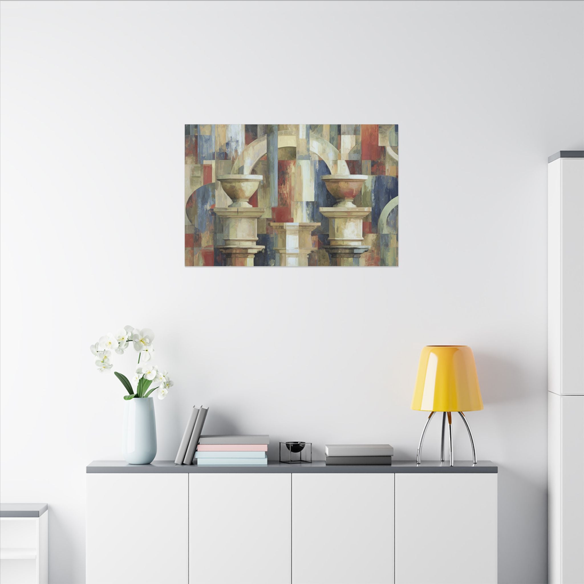 Architectural Symphony is an abstract architectural composition blending classical columns and arches with geometric modernism in earthy gold, indigo, and terracotta tones.