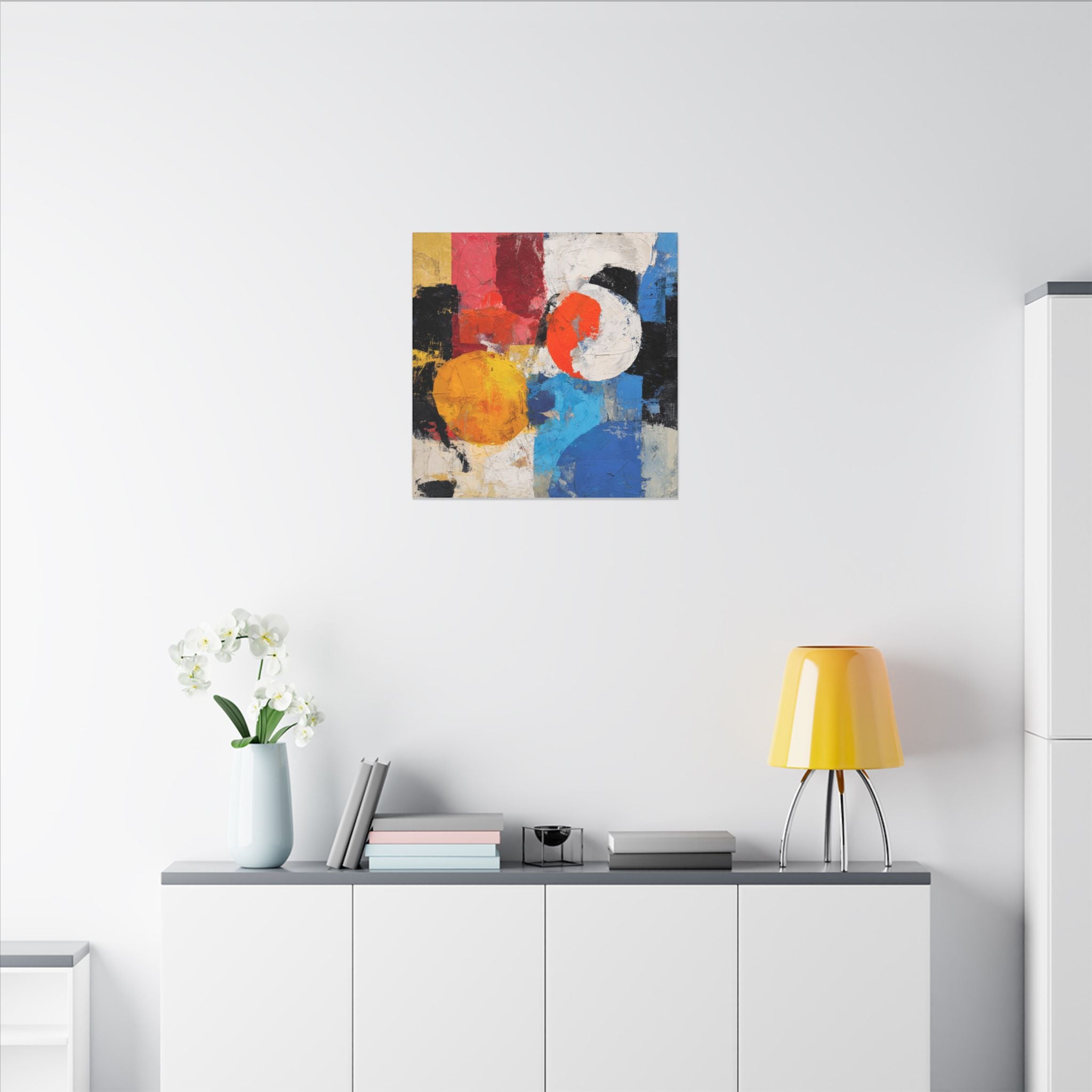 Prismatic Orbits is a bold collision of color and form, with bright yellows, fiery reds, and cool blues layered in textured circular shapes.
