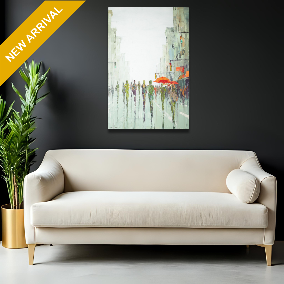 Urban Drift is an ethereal cityscape captured in rich texture and motion, “Urban Drift” blends cool hues and bold color accents to portray the hum of a modern crowd in painterly abstraction.