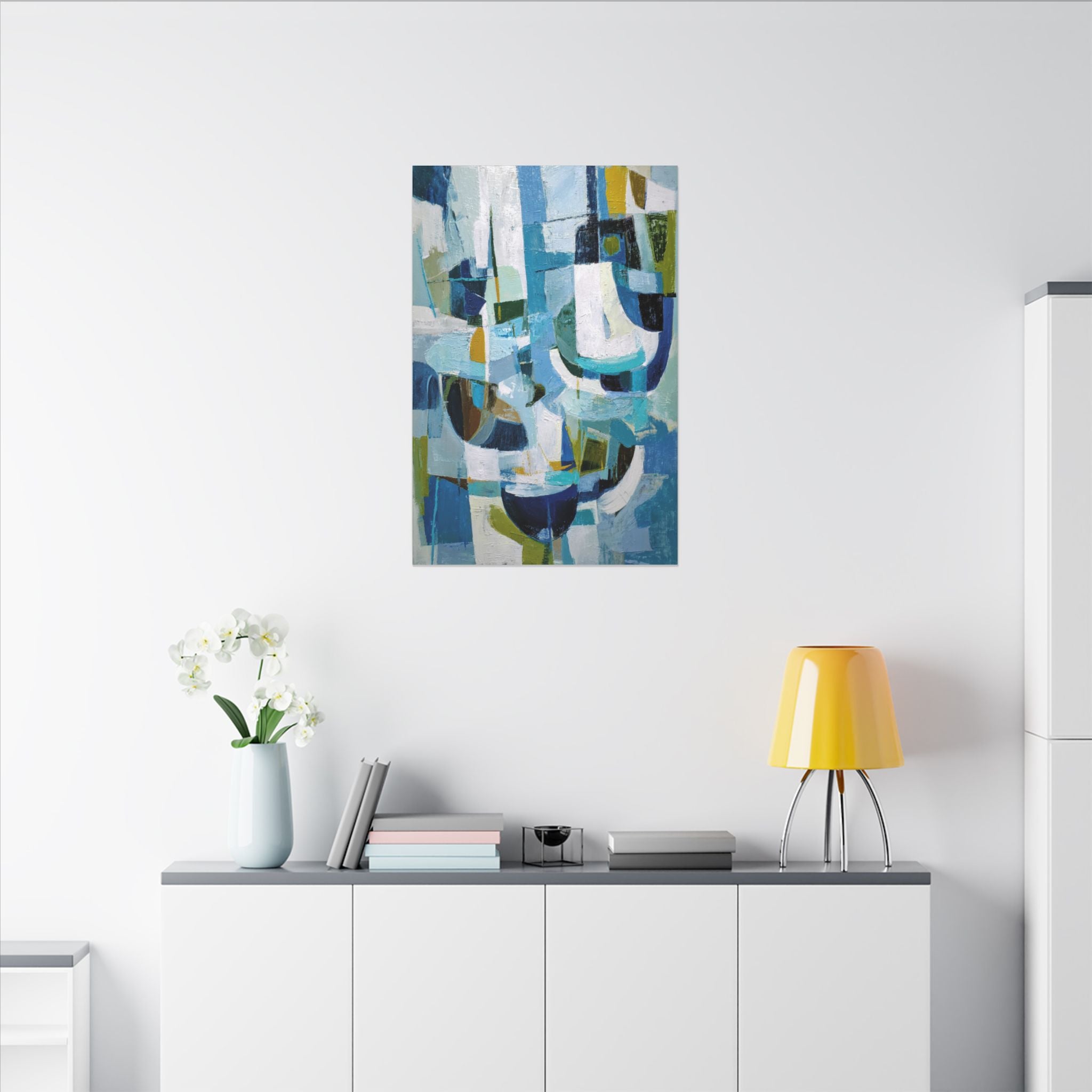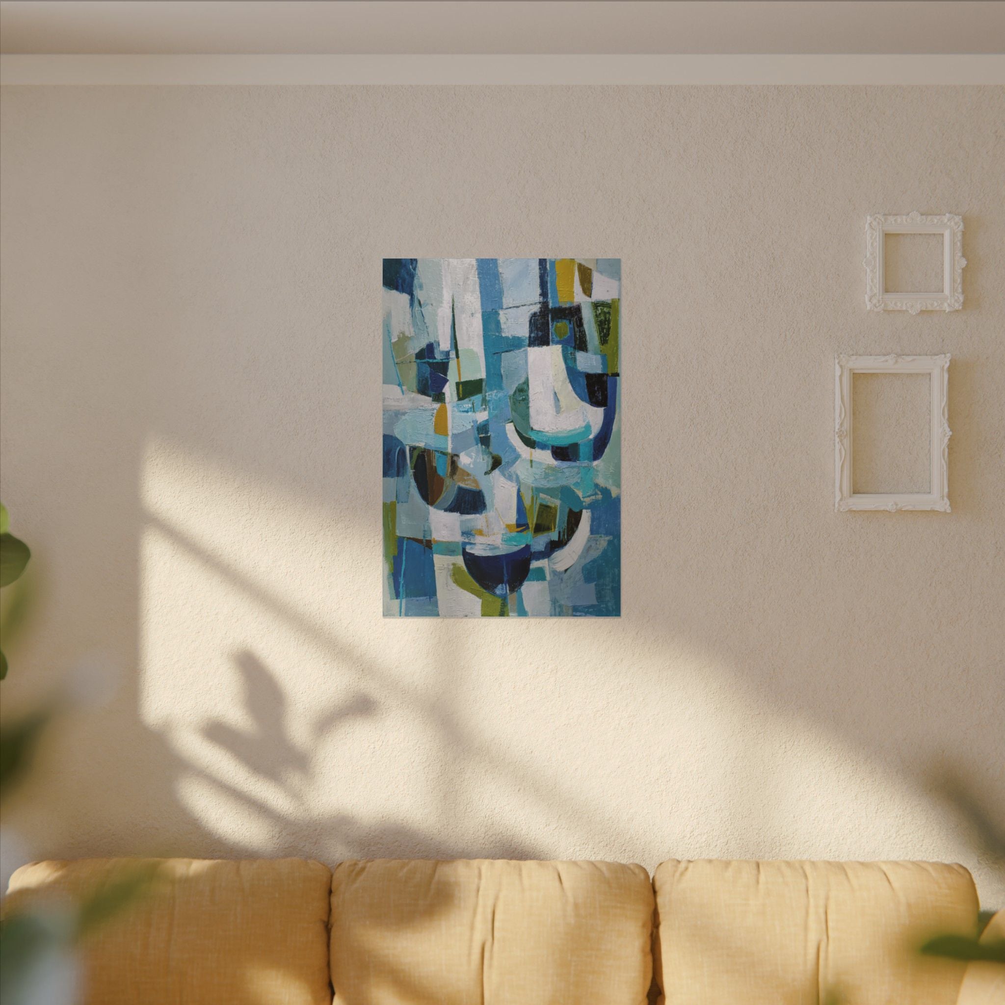 Azure Rhythm is a lively interplay of cool blues, greens, and hints of gold, layered in bold, geometric brushstrokes.