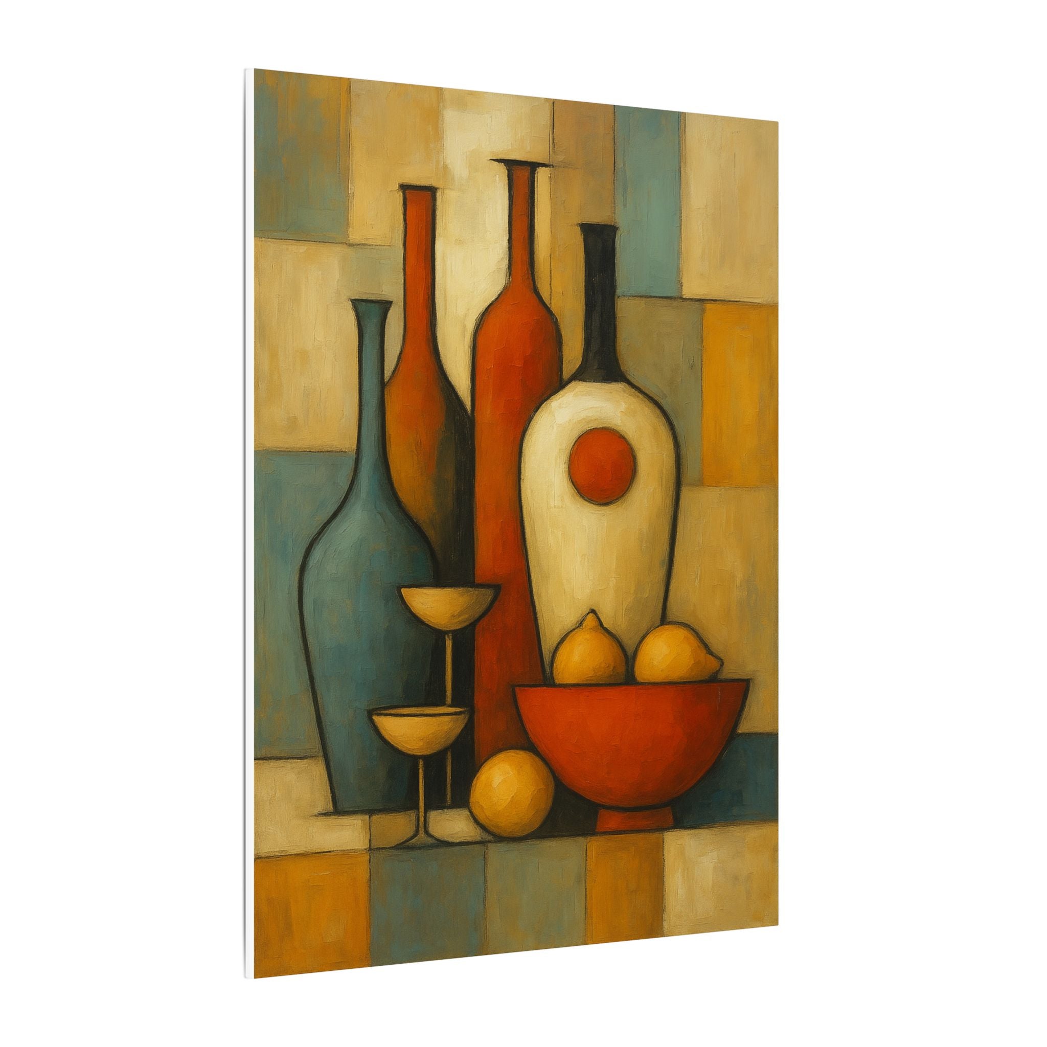 This geometric masterpiece is a stylized still life blending cubist geometry and bold outlines, featuring warm earth tones, fruit, and vintage bottles.